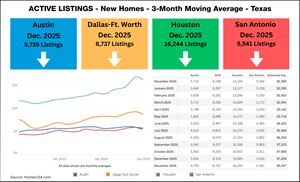 Texas new home inventory fell for the second month in a row, with active listings declining to 36,257 in December from 37,234 in November. Year-over-year, active listings were up 12 percent compared to 32,395 in December 2024. Houston had the largest inventory with 16,244 active listings. Dallas-Fort Worth followed with 8,737, while Austin and San Antonio posted 5,735 and 5,541 active listings, respectively.