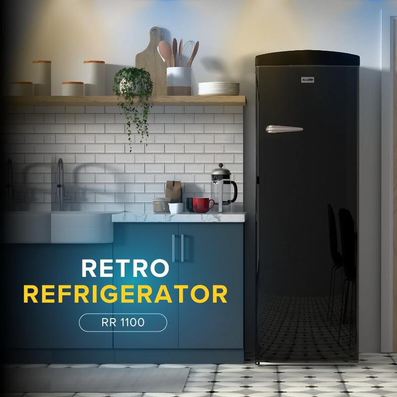 Designed for today’s energy-conscious households, the unit operates with R600a refrigerant and a powerful compressor motor for efficient, consistent cooling. Adjustable feet allow for proper leveling and performance optimization, while the refrigerator’s slim 24-inch width ensures it can integrate seamlessly into smaller kitchens without compromising capacity. Available in black and other classic finishes, this model brings retro charm into the present day, pairing visual appeal with modern reliability.