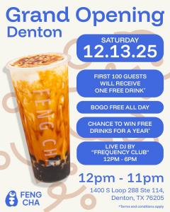 Located at 1400 S Loop 288, Ste 114, the Denton shop will officially open on Saturday, December 13th, celebrating with a full day of grand-opening festivities. The first 100 guests will receive one free drink, and visitors can enjoy Buy One, Get One Free beverages all day long. Guests will also have the chance to win free bubble tea for a year, and the celebration will feature a live DJ set by Frequency Club, creating an energetic and memorable introduction to the Feng Cha experience.