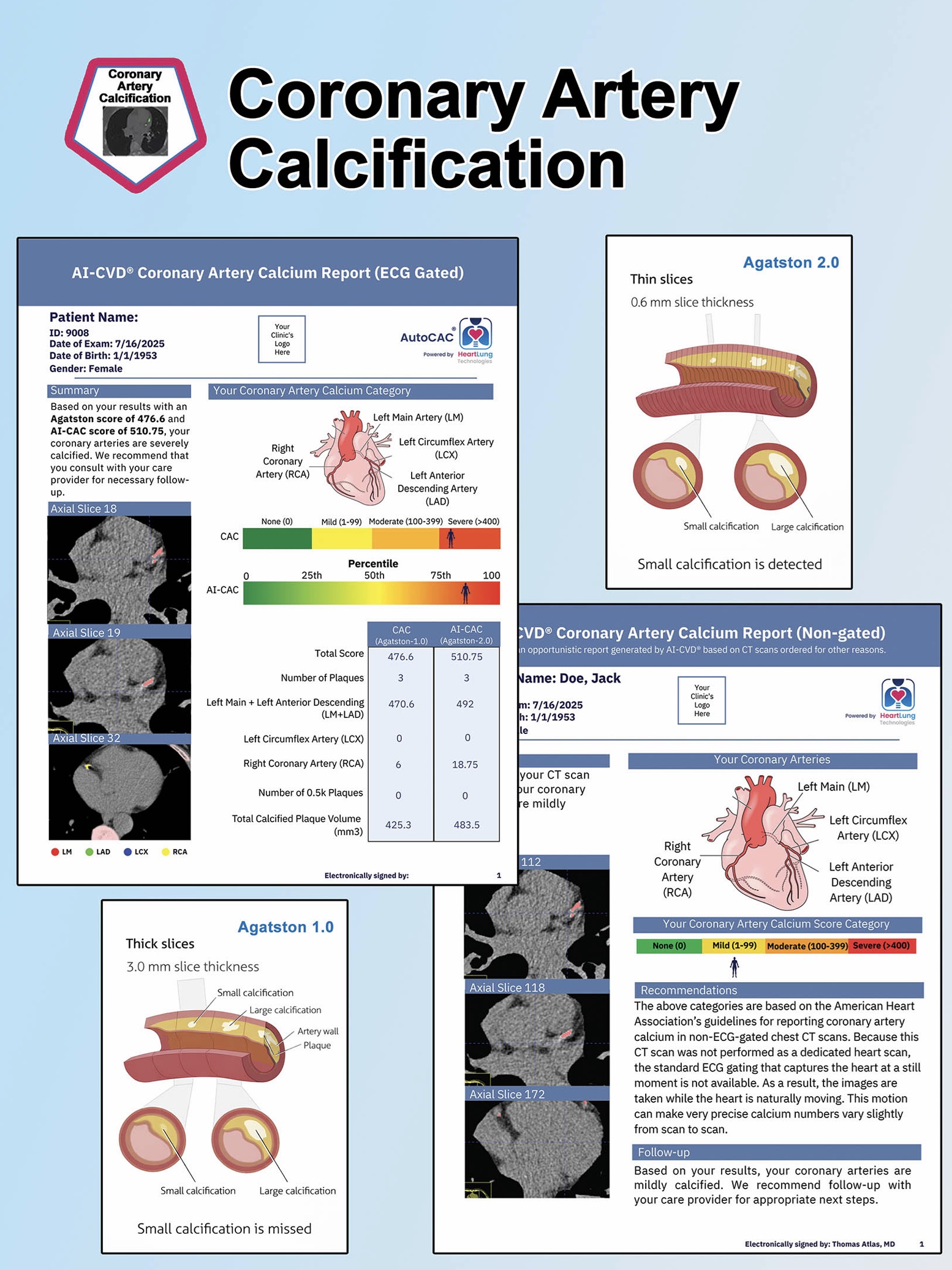 HeartLung AI’s AutoCAC represents automated Agatston 1.0, delivering fast, reproducible coronary artery calcium scoring aligned with the traditional CAC method at scale, while AI-CAC represents Agatston 2.0, an advanced AI-native approach designed to detect and quantify coronary calcium more sensitively, including earlier and lower-burden disease that may be underestimated by conventional scoring.